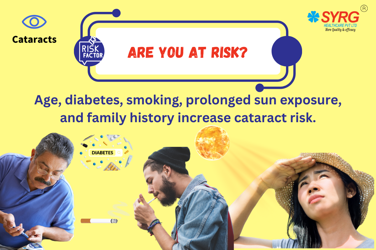 Certain conditions and habits increase the risk of developing cataracts, including aging (especially after age 60), diabetes, excessive sunlight exposure, smoking, obesity, high blood pressure, previous eye surgeries, and long-term use of corticosteroid medications. A poor diet lacking antioxidants also contributes. Women and people with a family history of cataracts are slightly more prone. Regular eye protection and healthy lifestyle choices can help lower risk significantly.