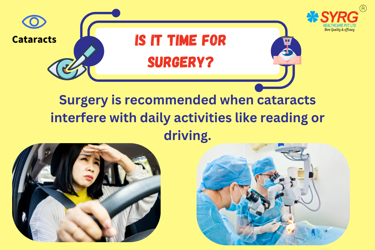 You should consider cataract surgery when blurred vision makes it difficult to perform daily activities like reading, driving, or recognizing faces. If corrective measures like glasses are no longer helping, or if cataracts impact safety (like night driving), surgery is often advised. Some people choose surgery earlier for professional or lifestyle reasons, while others wait longer if symptoms are mild. The decision should be made based on individual needs and after consulting an ophthalmologist.