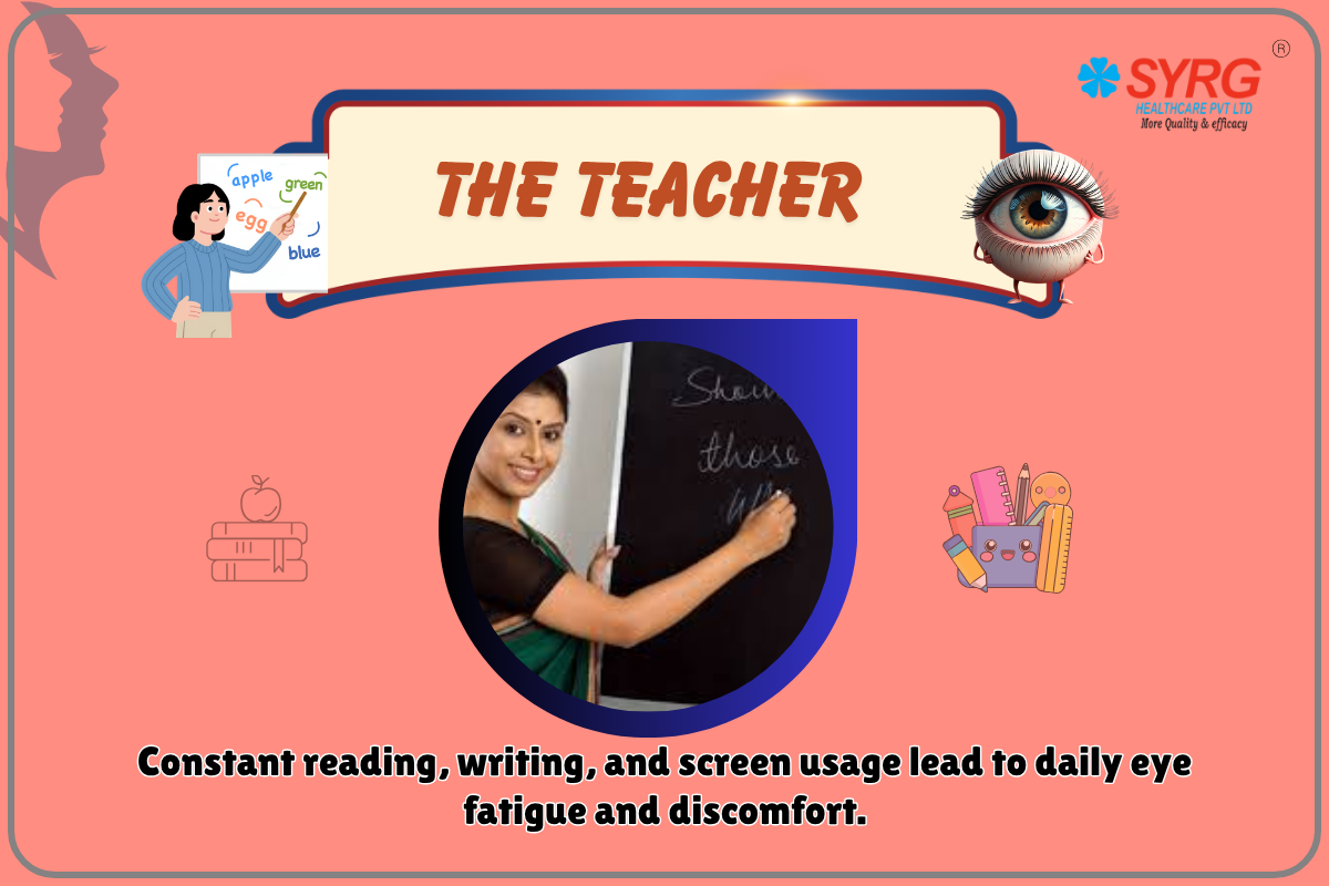 Poor classroom lighting, chalk dust, and continuous speaking also contribute to eye discomfort and dryness. Teachers often experience headaches, eye fatigue, and difficulty focusing by the end of the day.